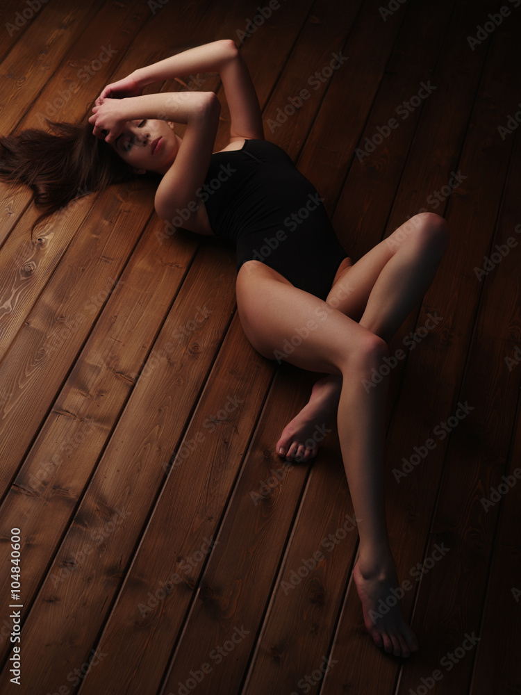 Seductive And Sexy Young Woman In Underwear With Dark Beautiful Long Hair And Hot Figure Is Lying Stretched On The Wooden Floor And Teasing Us Stock Photo Adobe Stock